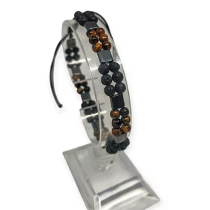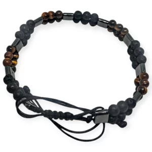 Wyjątkowa bransoletka to harmonijne połączenie trzech niezwykłych kamieni: tygrysiego oka, lawy wulkanicznej i hematytu. Każdy z nich od wieków ceniony jest za swoje właściwości ochronne i energetyczne, tworząc razem wyjątkowe trio, które wspiera zarówno ciało, jak i umysł.