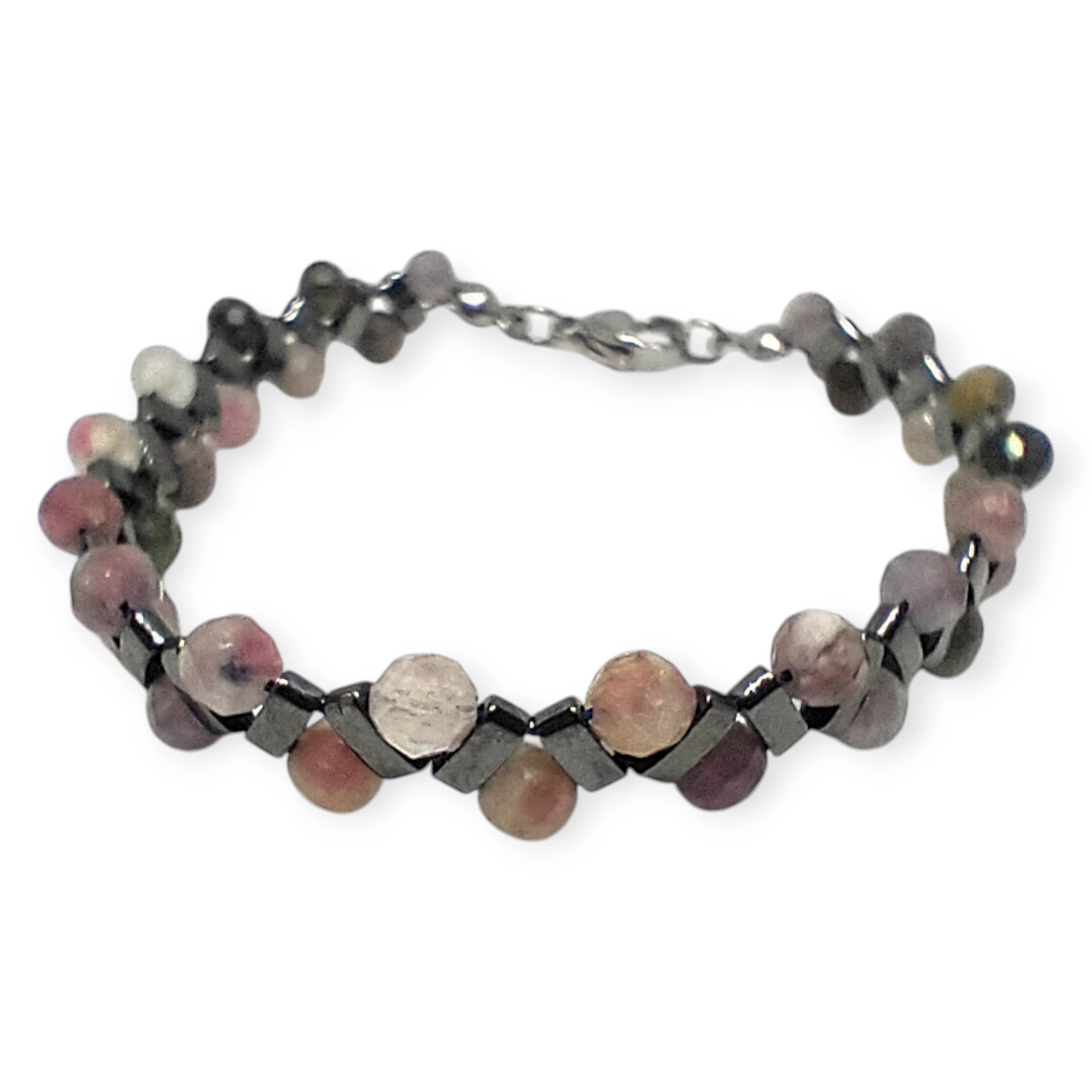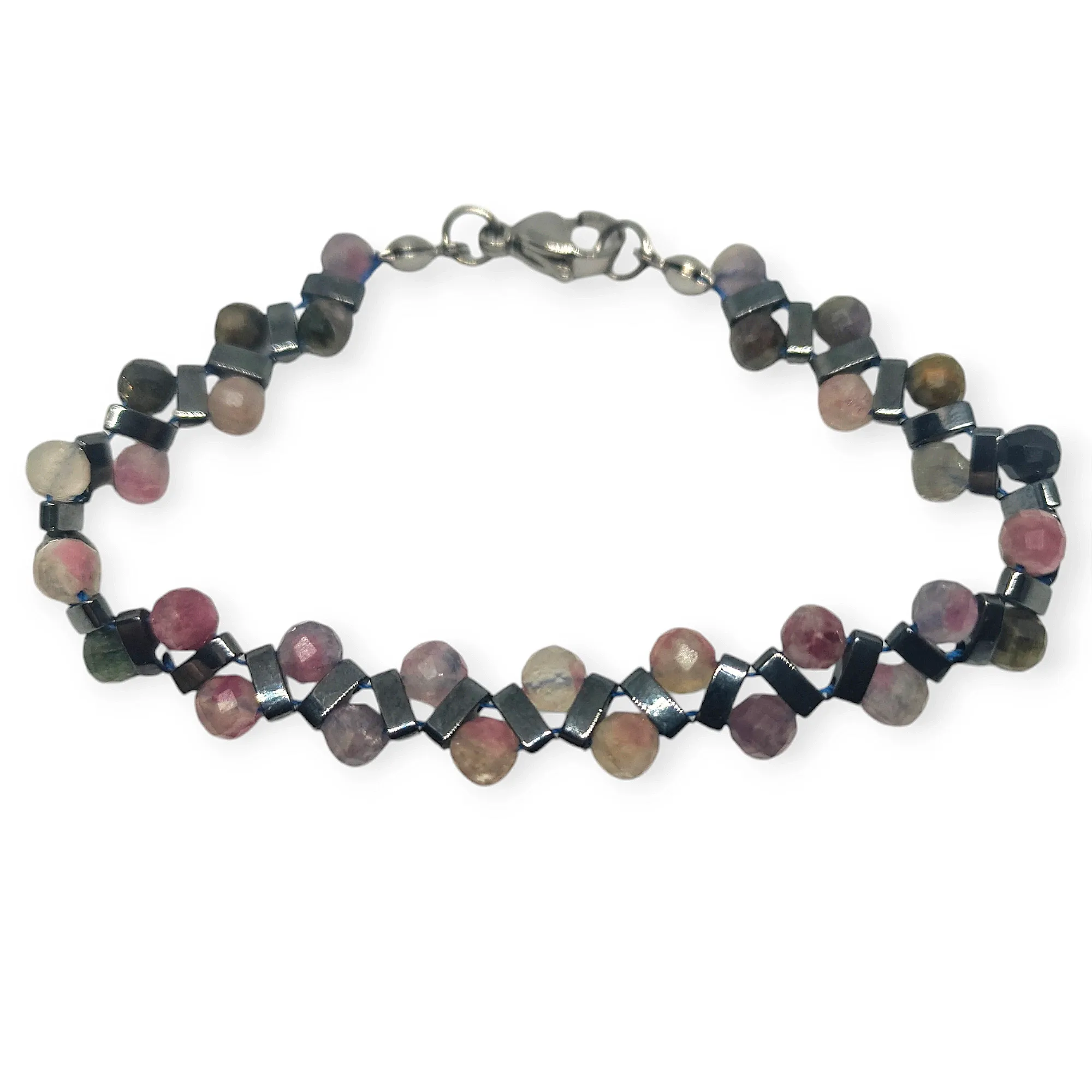 Harmonijne połączenie dwóch niezwykłych kamieni: kolorowego turmalinu i hematytu. Tęczowa paleta barw turmalinu dodaje radości i optymizmu, podczas hematyt emanuje siłą i energią. To połączenie tworzy wyjątkową kompozycję, która nie tylko pięknie wygląda, ale także wpływa pozytywnie na nasze samopoczucie.